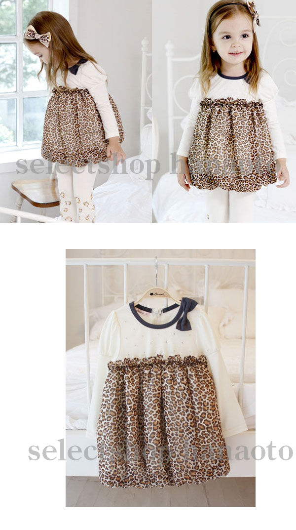 キッズはレオパード柄のワンピース、アクセントのリボン付き。