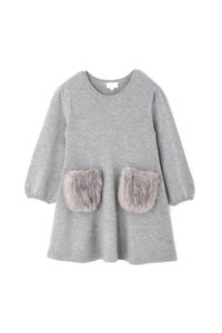 ふわふわのファーポケットが目を惹くニットワンピース。パフスリーブ&フレアシルエットで女の子らしさ全開♡
