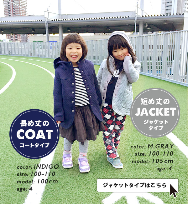 薄手だけれど暖かいカットソーキルト。大人用のコートのこだわりをそのまま詰め込んだこだわりのコートです。素材も綿100%なので肌にも優しく静電気も起きにくい。フード口はキャンパス生地になっているので、フードの形を崩さず綺麗なシルエットで着ることができます。ママとお揃いの同じデザインのコートなんて嬉しいですね。