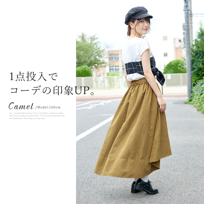 ふんわり可愛いシルエットのフレアスカート。前と後ろで長さを変えたおしゃれ度の高いデザインです。起毛のあるピーチ生地なので、上品で優しい印象を与えます。
