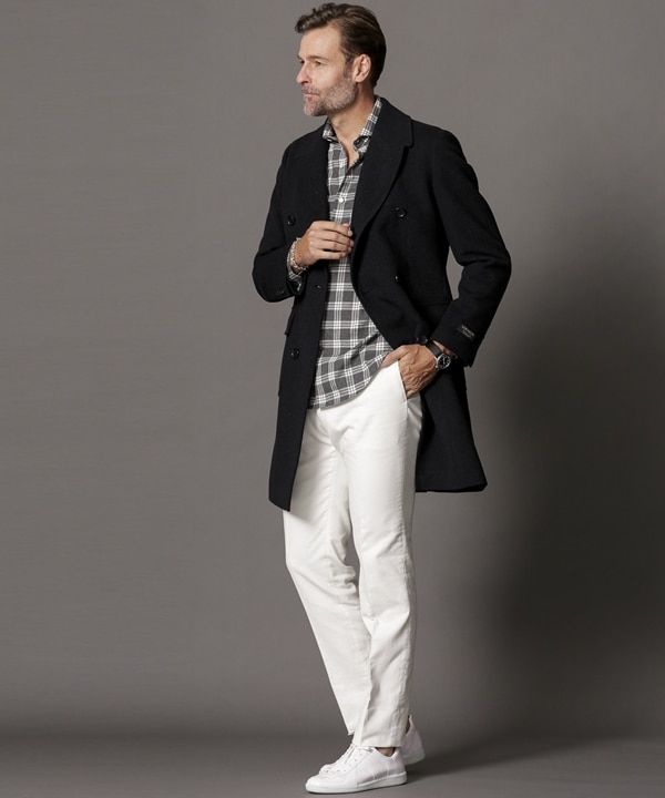 トップスやマフラーの色や柄を引き立てたいときにブラックのチェスターコートは役立ちます☆