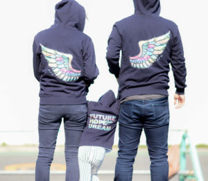 FUTURE、 HOPE、DREAMの気持ちを込めて作られたパーカーです。子どもたちが未来に羽ばたけるようにと願いを込めて、そしてパパとママがその子どもの未来を支え助けられるようにと、羽のデザインとなっています。ジップアップなので、子どもも気軽に羽織れるタイプです。親子でこんな未来のメッセージを込めたリンクコーデをしたら注目の的ですね。