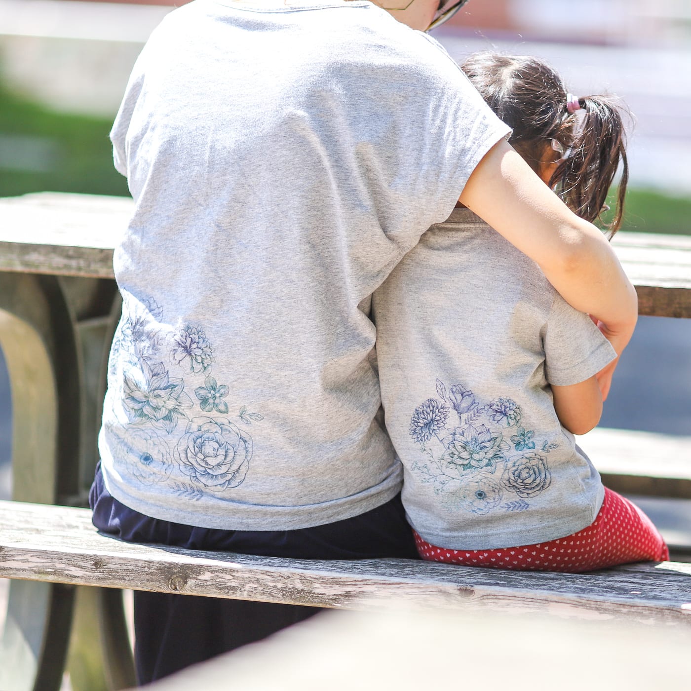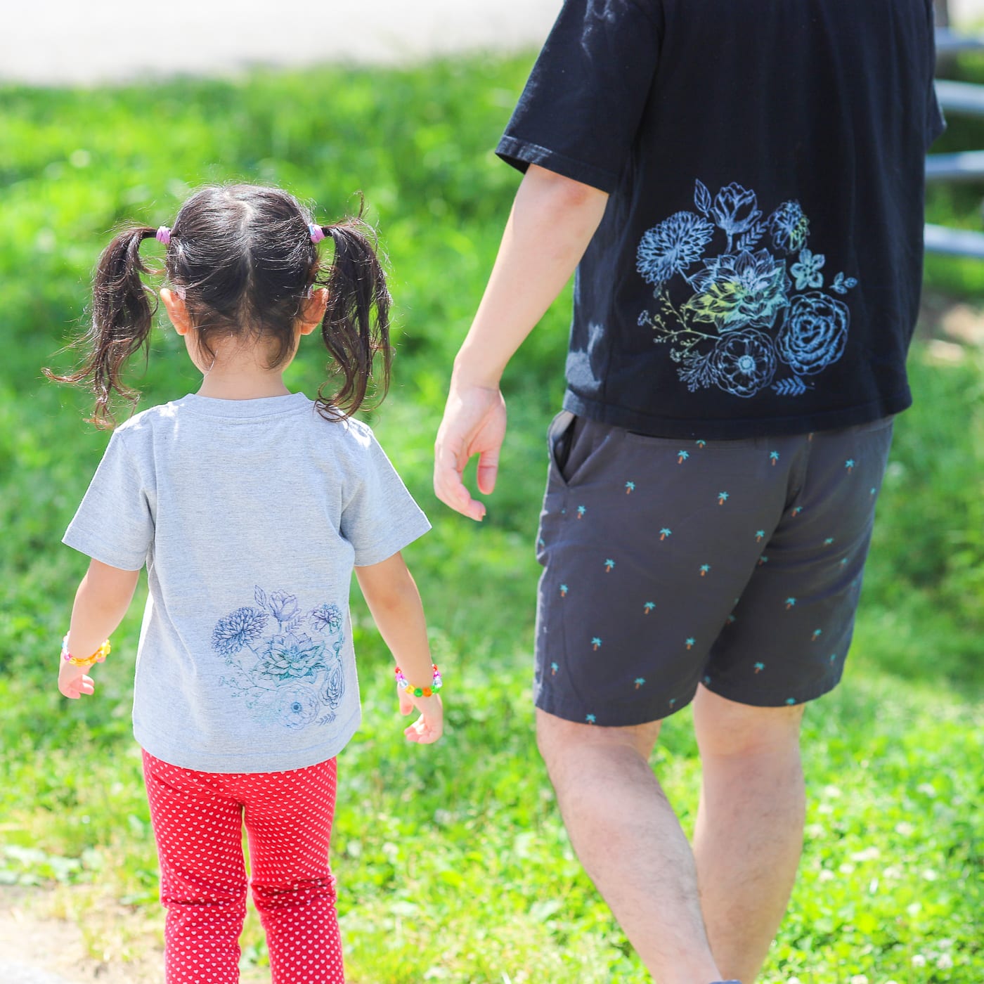 さりげないバックプリントの親子リンクコーデFlowersバックプリントTシャツ