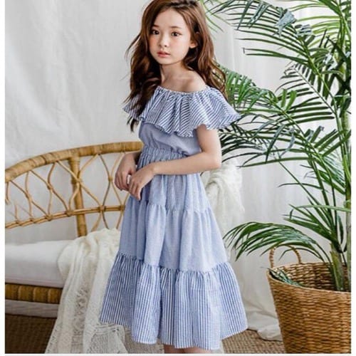 ブルーのストライプのロングワンピース。襟部分がゴムになっているので、肩までずらしてオフショルダーとしても着ることができるワンピースです。素材が綿なので、さらっと涼しいですね。