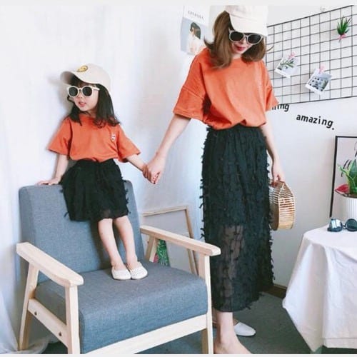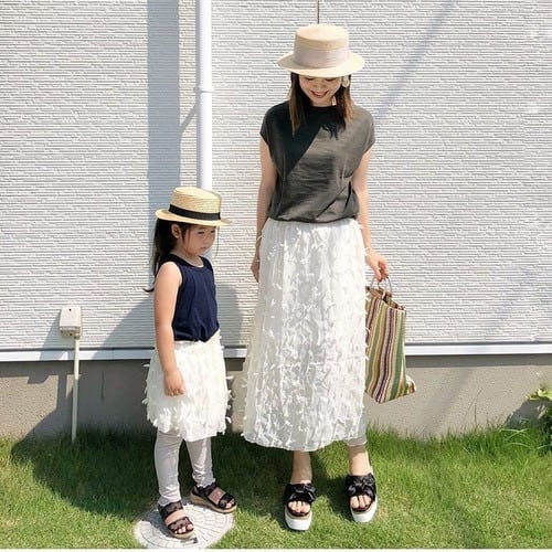 透け感がかわいいスカート。ママとリンクコーデすることで、おしゃれ感がアップしますね。