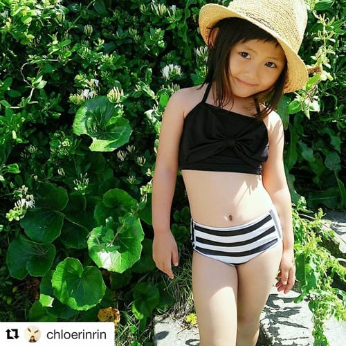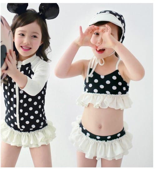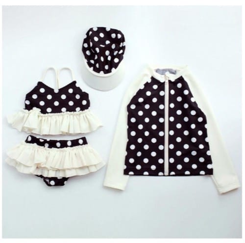 黒地に白のドット柄、水着だけでなく、こちらの商品は、帽子も付いたビキニのセット。水着のフリルがかわいいです。別売りでお揃いのラッシュガードも一緒に着れば、日焼け防止にも安心!姉妹で水着のリンクコーデを楽しみましょう。