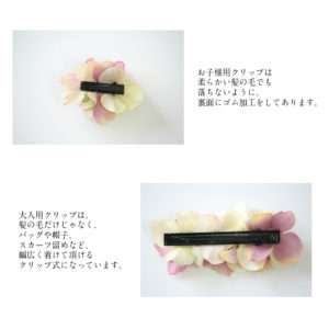 ママ用クリップは、髪の毛以外にも使えるように大きめサイズ。アジサイが大ぶりで可愛いです♪
