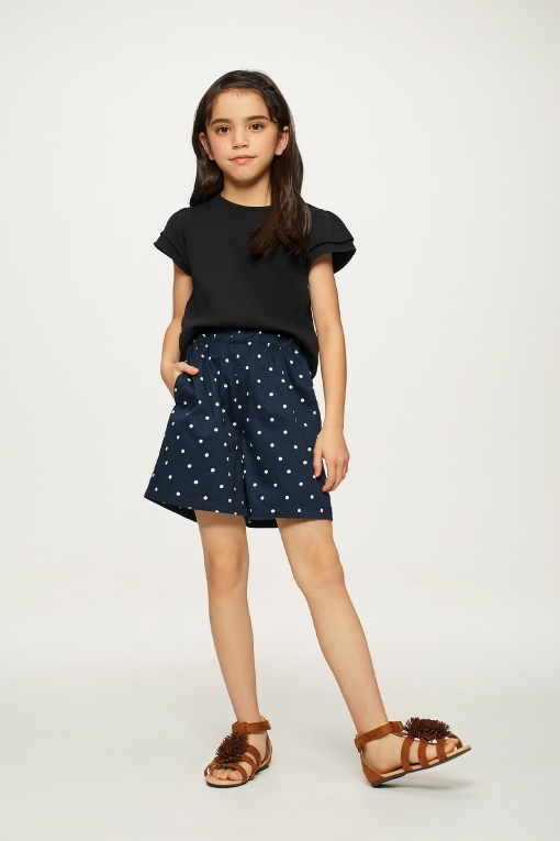 ウエストから広がるギャザーのシルエットでスタイルも良く見えます。ドット柄が可愛いく姉妹で着こなせます。