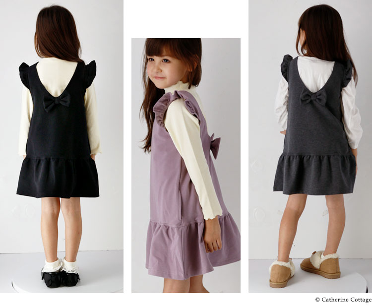 1年を通して着こなせるジャンパースカートです。薄手だけれど裏毛スウェット素材で暖か。また、伸縮性のある素材なので、子どもの動きを妨げません。シワにもなりにくいのが嬉しいですね。デザインも、コサージュとバックリボンの2種類タイプがあるので、姉妹で好きなタイプを選びましょう。