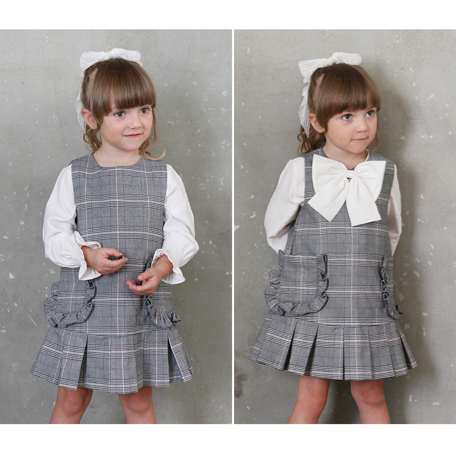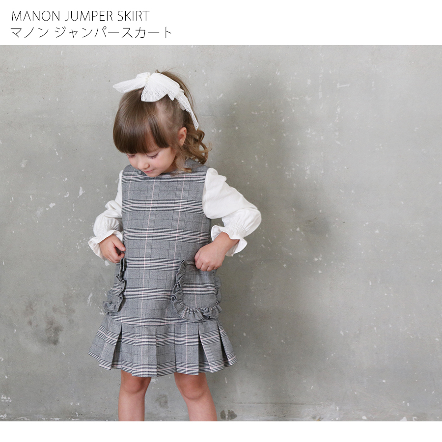 グレンチェックのジャンパースカートは、上品な印象を与える可愛いワンピースです。ポイントは大きなフリルポケット。ちょっとしたお出かけにも活躍できます。
