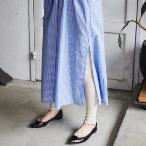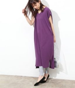 淡い色のワンピースにメロウレギンスを合わせとフワッと女性らしいコーデが完成します。