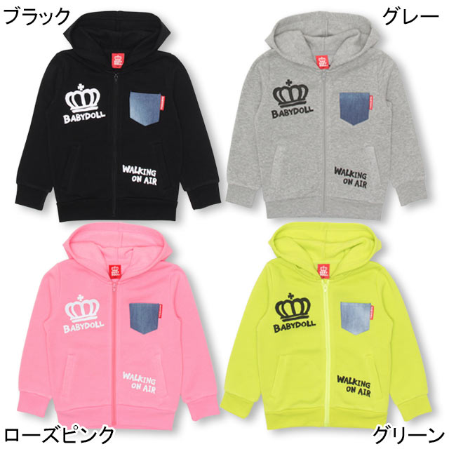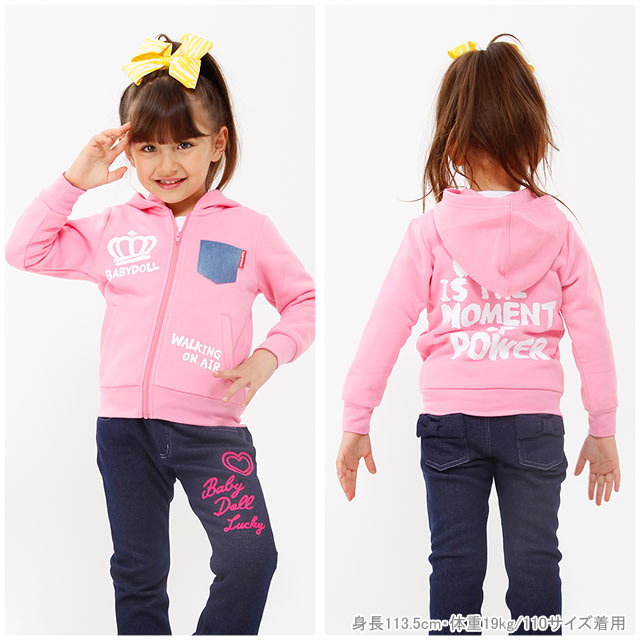 手書き風のメッセージが背中に入っていて、ワンポイントのデニム生地のポケットが可愛いパーカーです。暖かい日にも脱ぎ着しやすく、肌寒い時にさらっと羽織れるので便利ですね。