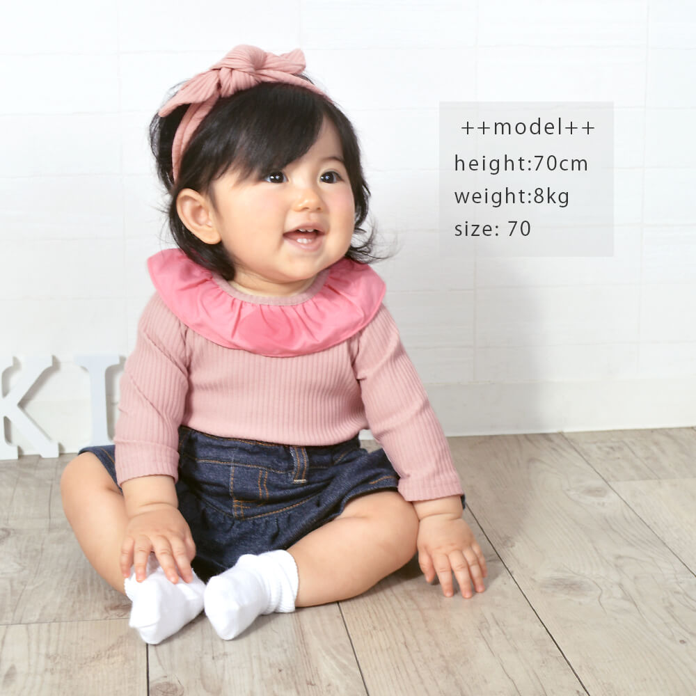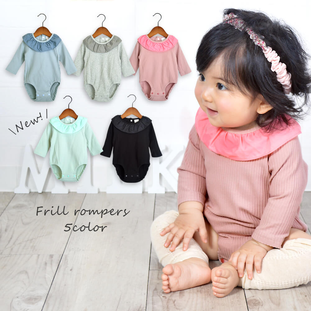 明るめの色を着ると、パッと華やぎます。ピンクの色味と、フリルが可愛いロンパース。通気性の良い軽めのリブ素材なので、赤ちゃんにも安心です。