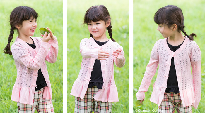 温度調節しやすいカーディガンは、やっぱり1枚あると便利ですね。裾のペプラムや透かし柄がとっても可愛いです。小さなリボンをアクセントに、甘めのコーディネートが完成です。