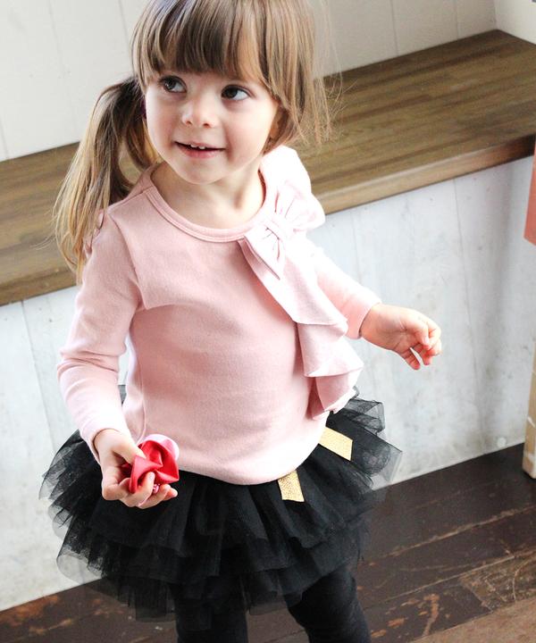 ラップフリルとリボンが特徴の女の子のトップスです。