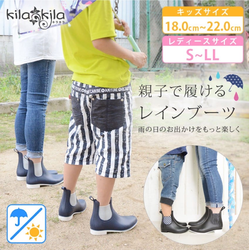 カラーも、ベーシックなブラックとネイビーの2色展開になっています。シンプルだからこそ、どんなコーディネートにも合わせやすいショートブーツ。デニムや、スカートにもぴったり。オールシーズン活躍してくれます。兄弟姉妹とママでリンクコーデが可能なレインブーツとなっています。
