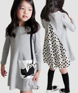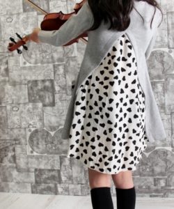 Aラインワンピースです。バック部分にはレオパード風のハート柄の生地で、ふんわりと広がるシルエットを作ってくれます。表は、子猫のショルダーバックのプリント柄が可愛いらしいデザイン。モノトーンの色使いなので、コーディネートによっては、甘めにもクールにも着こなせます。