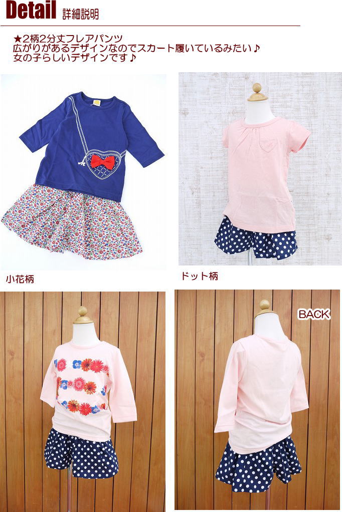女の子らしい小花柄とさわやかな雰囲気のドット柄のフレアーパンツ。
