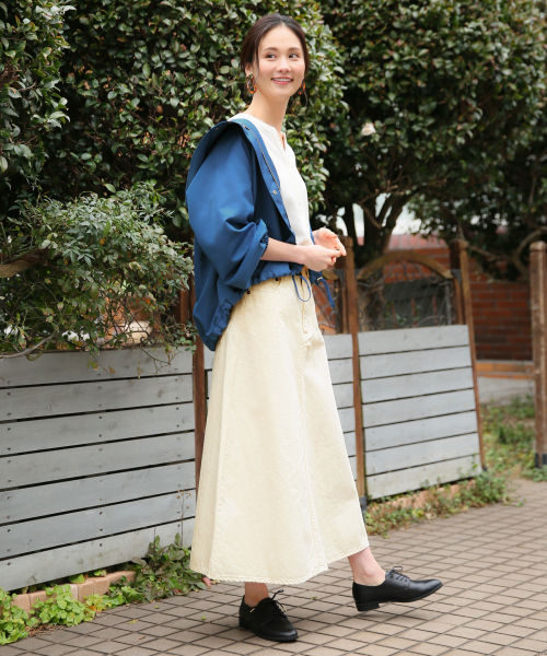 こちらのマウンテンパーカーは着丈が短めで袖がゆったりしているのでスカートにもパンツにも合わせやすい形です。また裾をしぼることもできるで雰囲気を変えて着ることもできます。