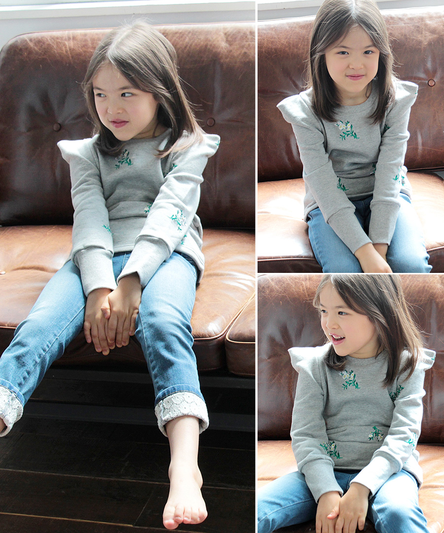 子供服Roraならではの肩のディテールのデザインは、スウェットであってもフェミニンな雰囲気を演出してくれます。シンプルなデニムやボトムスに合わせるだけで周りと差がつくデザインです。