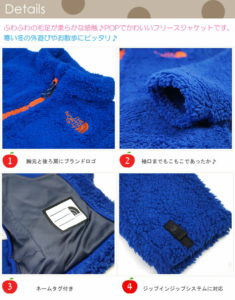 表地は撥水性、ストレッチが効いている素材が使用されています。裏地には、毛足の長いフリースを使用していて、暖かく人気のジャケットです。色も豊富にあるので、子どもたちのお気に入りが見つかるはずです。