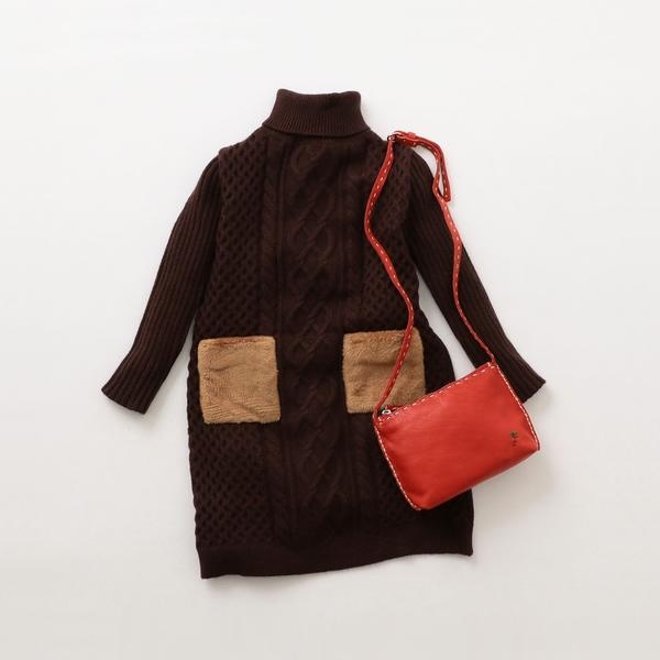 ポケットがアクセントになっているニットワンピースです。ダークブラウンにキャメルポケット、レッドバックの差し色があり、このセットでおしゃれが決まりますね。