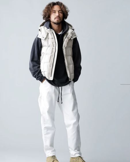 細身なシルエットが特徴のホワイトのダウンベストです。独自の加工で高い保温性があり、更にとても軽く着心地も◎
