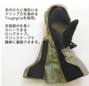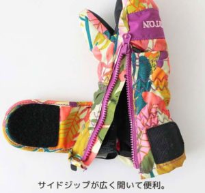 チャックがついていて着脱が楽にできます。手首も長いので雪遊びにピッタリ!