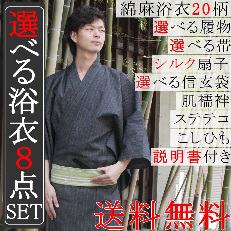 【よくばり!選べる浴衣8点セット】選べる浴衣!選べる帯!選べる履物!シルク扇子!選べる信玄袋!肌着セット!腰紐!着付け説明書付き!